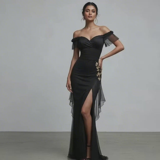 Step into the spotlight with our Celestial Black Zen Z Thigh-Slit Glam Gown , a trend-defining masterpiece designed for the modern fashion lover. Crafted in a sleek black silhouette with a bold thigh-slit and soft mesh drapes, this gown blends high-fashion elegance with the fresh, aesthetic energy Gen Z adores. The off-shoulder neckline and gold floral detailing elevate your look instantly, making it the ultimate pick for cocktail nights, luxury events, and red-carpet moments. If you're searching for a viral-worthy designer dress, this is your new go-to — timeless, glamorous, and effortlessly iconic.